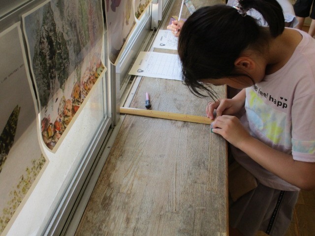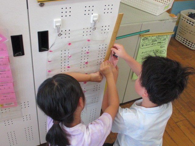今日は、30㎝ものさしで身の周りにあるものの長さを測りました。自分の持ち物や机、ロッカーや棚などいろいろなものの長さの予想を立ててから測り、「予想通りだったよ」「思ったより長いんだね」などと話しながら熱心に取り組みました。