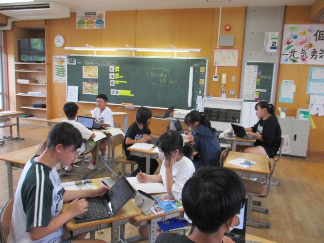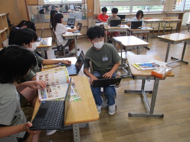 歴史の学習で弥生時代のくらしについて自分で課題を決めて調べています。実際に作ってみたり、スライドに工夫してまとめてみたりしています。