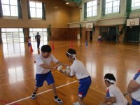 じゃんけんで気の合うペアを見付け、ペアでタッチゲームや縄跳びをした後、色団対抗...