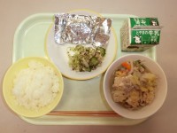 今日の献立は、ごはん、牛乳、いわしの土佐煮、納豆和え、卵とじです。納豆和えは、た...