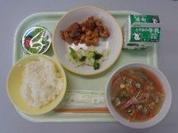 今日の献立は、ごはん、牛乳、豚肉ジャンロー、ゆでブロッコリー、かきたま汁です。豚...