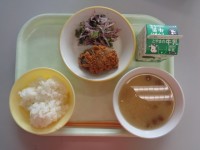 今日の献立は、ごはん、牛乳、鶏そぼろと炒り卵の二色丼、なばなひたし、白玉汁、ひな...