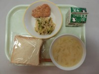 今日の献立は、食パン、牛乳、チキンフィレ、大根サラダ、かぼちゃクリームスープです...