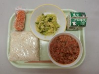 今日の献立は、ソフト麺、牛乳、ソフト麺のミートソースかけ、アスパラサラダ、チーズ...