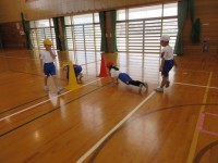 じゃんけんで気の合うペアを見付け、ペアでタッチゲームや縄跳びをした後、色団対抗...