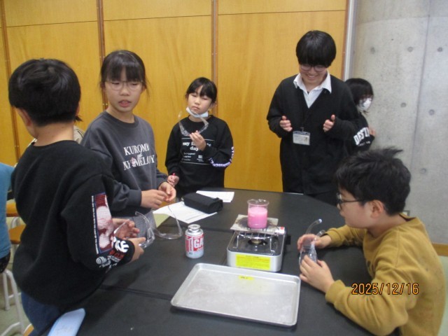 理科の支援員の先生と一緒に実験を行いました。色で温度の変化が分かるので、あたた...