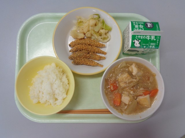 今日の献立は、ごはん、牛乳、きびなごのさくさく揚げ、レモン和え、厚揚げの中華煮込...