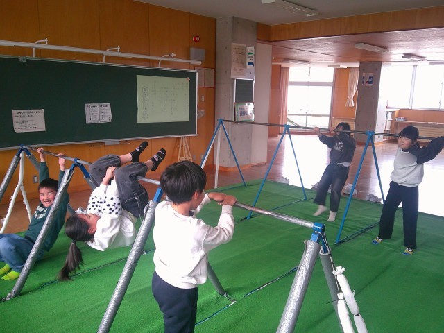 休み時間に、一生懸命鉄棒に取り組んでいます。