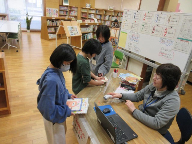 図書室で本を選んでいます。