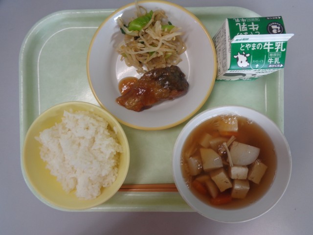今日の献立は、ごはん、牛乳、鯵の梅風味かば焼き、もやしのおひたし、のっぺい汁です...