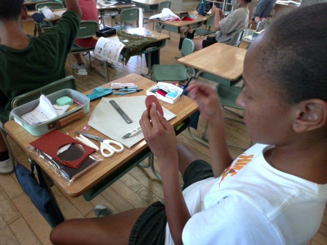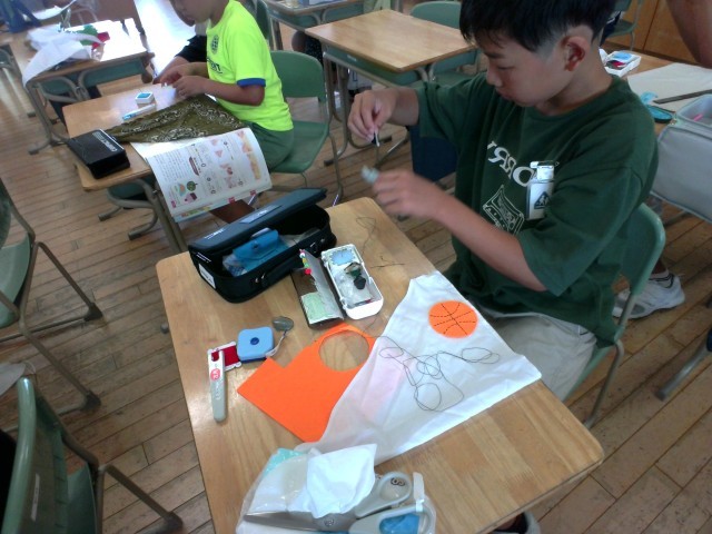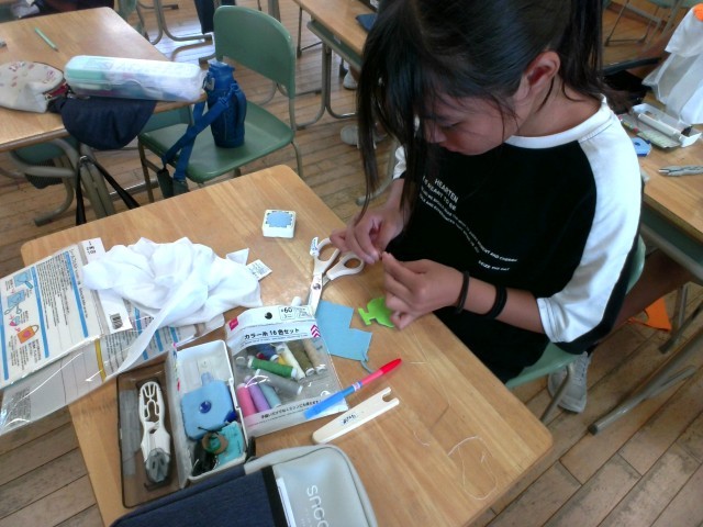 家庭科では、これまでに学習した縫い方を用いて「マイ三角巾」を作成しています。
