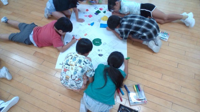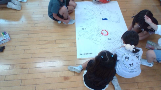 1年生に学校についてくわしくなってもらおうと、学校の全体図を用いて説明文やクイズを考えています。