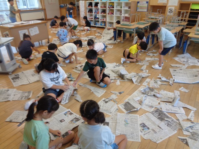 図画工作科で新聞紙を破いていろいろな形に見立ててちぎったり、並べたりしました。わにに見えるものもあれば、ロボットに見えるものがあるなど、自分の見えるものに心を輝かせて作っていました。