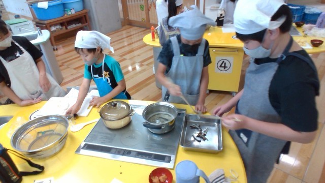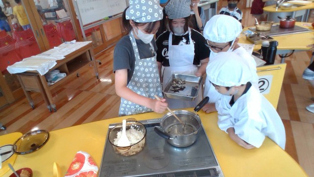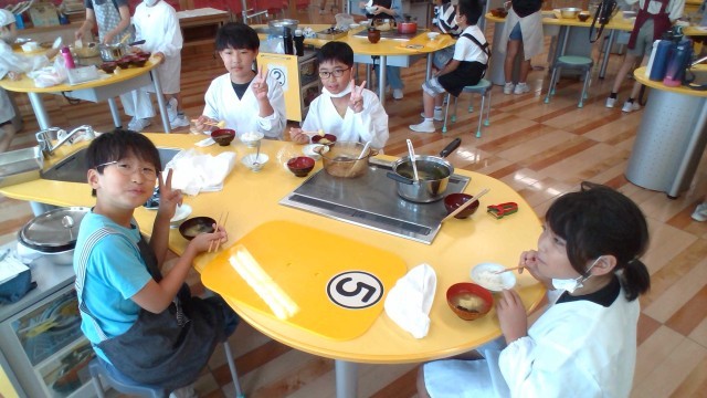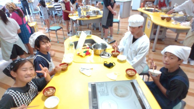 調理実習でご飯とみそ汁を作りました。「おこげがおいしい」「自分で炊いたから、おいしく感じる」「だしのきいたお味噌汁になった」など、各班大満足のできに仕上げることができました。