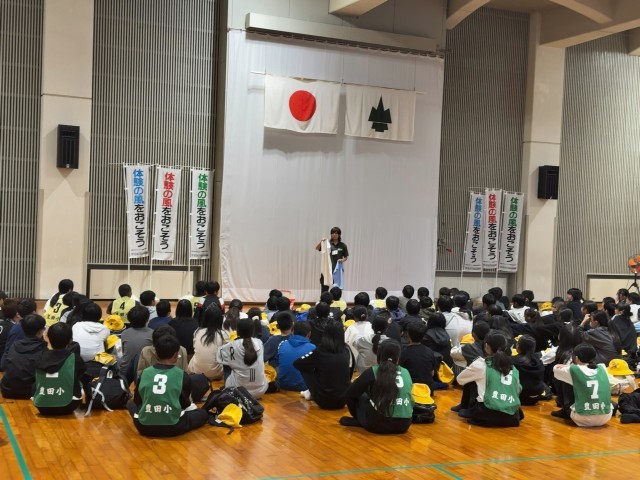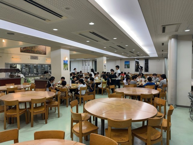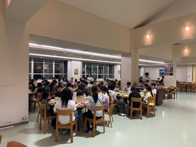 国立立山青少年自然の家で入所式を終え、夕食を食べています。