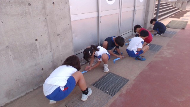 日なたと日かげの地面の温度を棒温度計で調べました。子供たちは日なたの地面の温度は、日かげの地面の温度よりも高くなっていることに気付いていました。