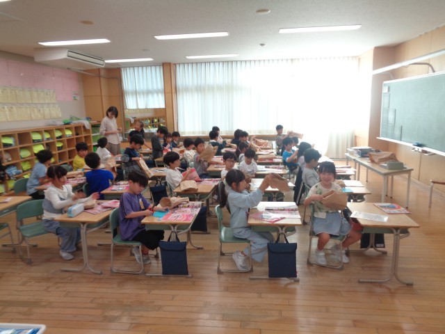 図画工作科では、紙袋をくしゃくしゃにして口を作り、見えたものに合わせて色用紙を使って表現しました。