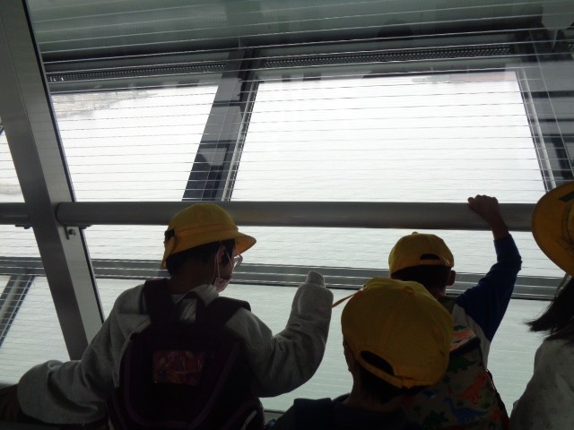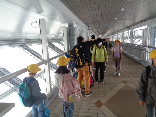 あいの風プロムナードを歩いて、渡船場に向かいました。子供たちは、窓から見える絶景を眺めながら、一生懸命歩きました。