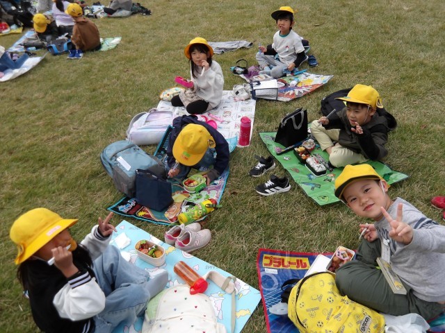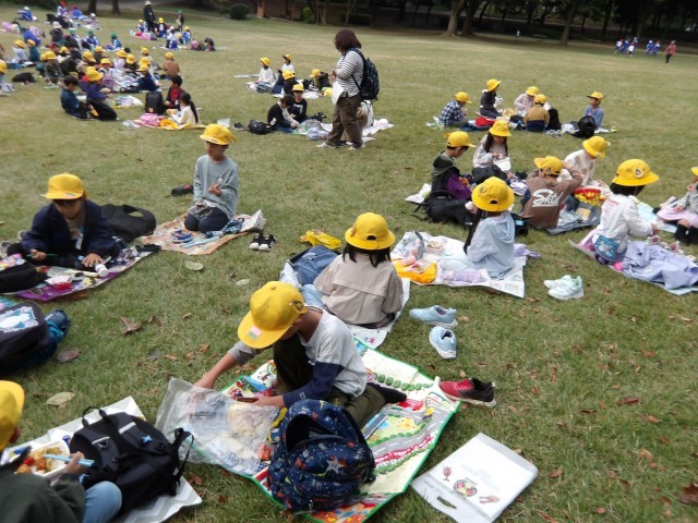 芝生広場に着いてからは、お楽しみのお昼ご飯をグループの友達とみんなで仲良く食べました。