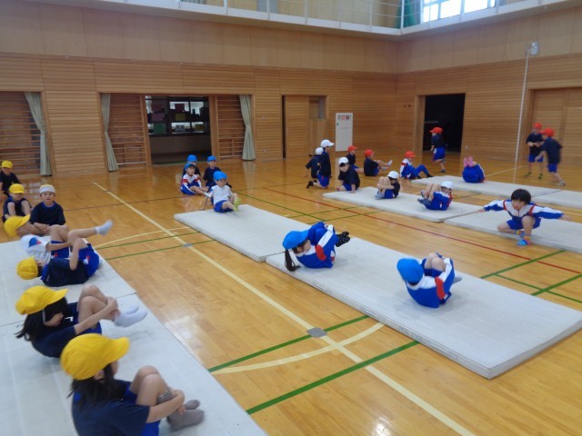 一年生は、体育科でマット遊びをしています。動物や植物になりきってたくさん転がりました。