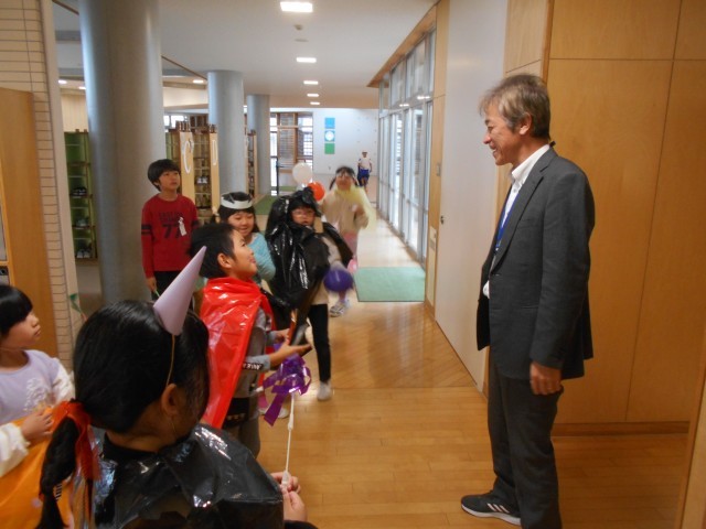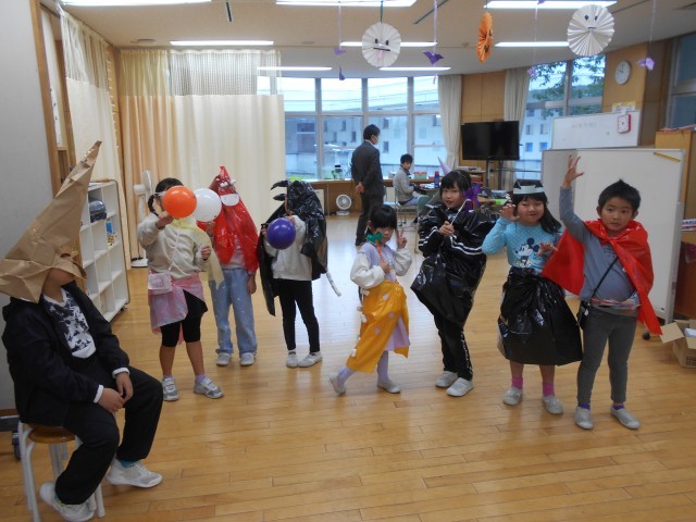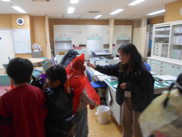 仮装の衣装ができたら、みんなで校内を歩きました。途中で出会った先生には「ハッピーハロウィン!」「いたずらしちゃうぞ~」と握手をしたり脅かしたりして、楽しみました。