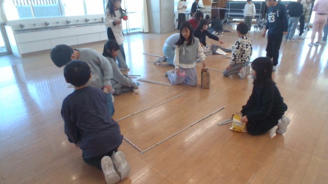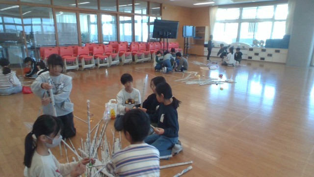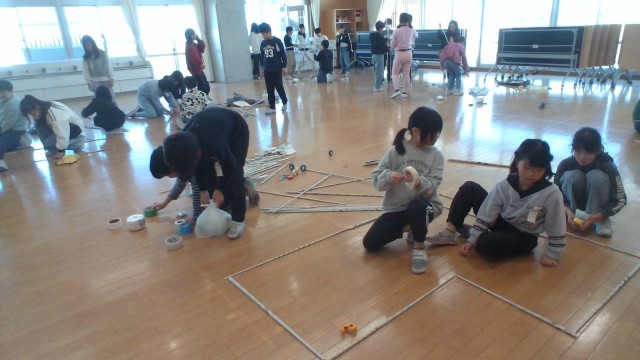 図画工作科の時間、新聞紙の棒を何本も使い、作品を作りました。