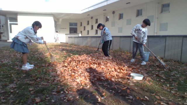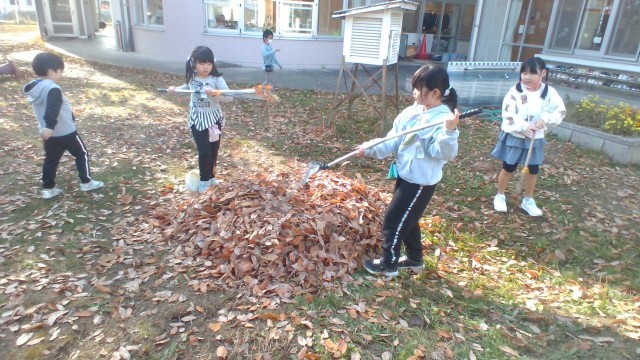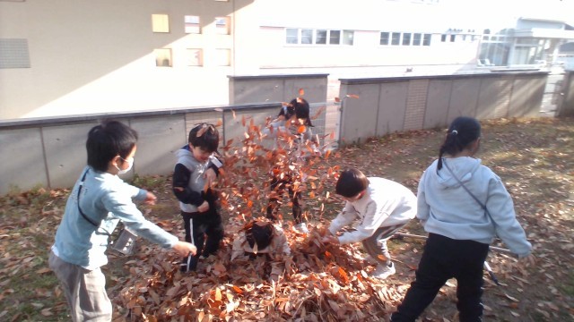 木枯らしで葉が舞い散っているのを見て、「落ち葉で遊びたい!」と子供たちから提案がありました。