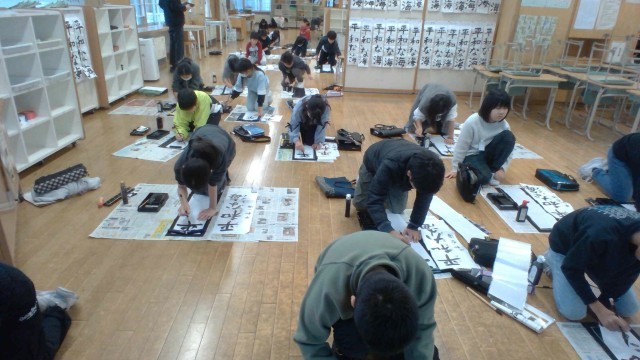 書初め大会をしました。心を込めて丁寧に書いています。