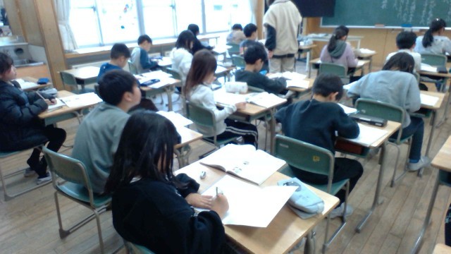 4枚の絵を見てお話を書いています。お話作りでは、一人一人が自分で登場人物の名前や状況を考えて楽しく書いています。