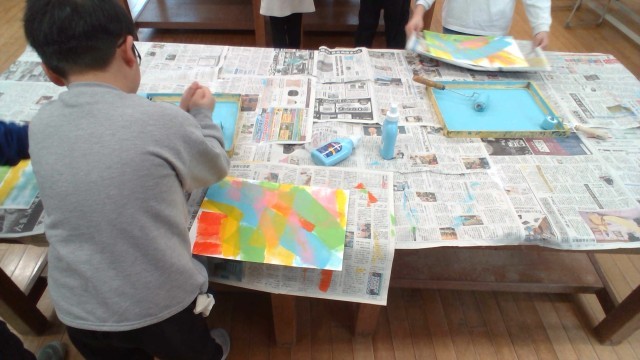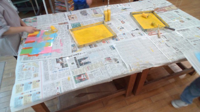 今日はステンシル版画の1回目の色付けをしました。