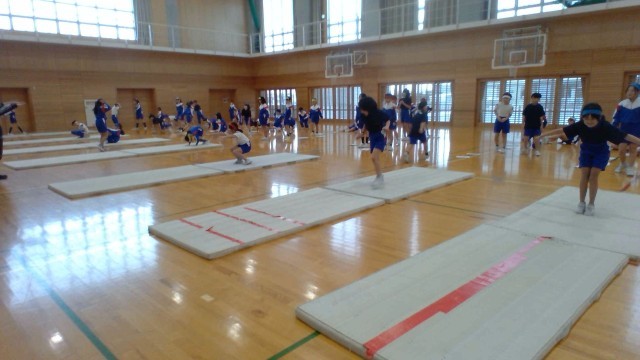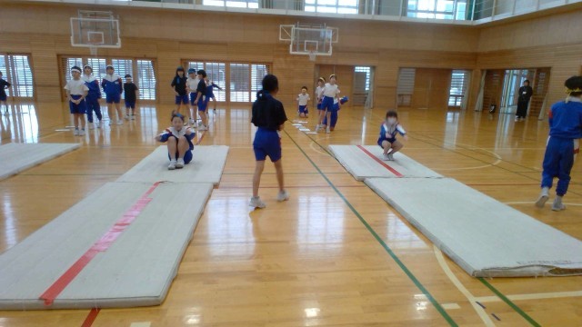 体育科では、マット運動で体を動かしています。