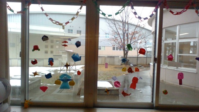 教室の窓には、子供たちがつくった折り紙がたくさん飾ってあります。