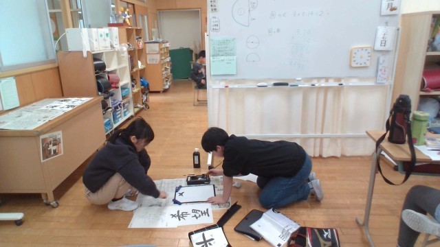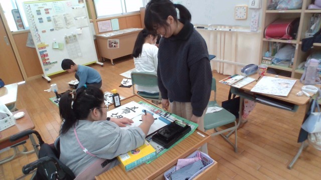 「希望」という字を書きました。6年生が、文字を丁寧に書くコツを伝えています。