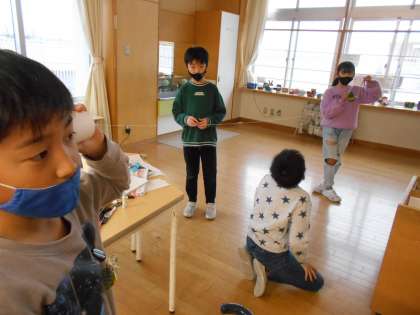 その後、紙コップの底に穴を開けて糸を通し、紙コップの反対側の糸にトライアングルを付けて、音がどのように伝わるか調べました。