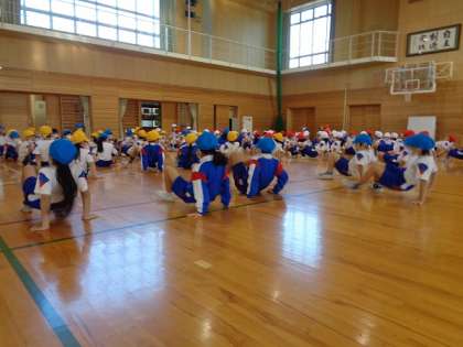 今日の体力つくりでは、「あざらし歩き」や「くま歩き」、「くも歩き」等、動物の動きで、腕や足でしっかり支えて体を動かしました。1年生のときよりも、しっかりと体を支えることができるようになっています。