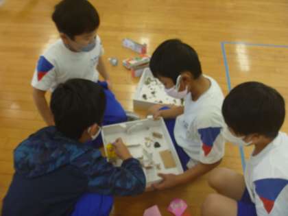 米田公園で集めたどんぐりや落ち葉を使って、おもちゃを作りました。どんぐり迷路、やじろべえ、どんぐりすくい、どんぐりマラカス、どんぐりのおうち等たくさんのおもちゃができました。今日は、みんなで遊んで楽しみました。