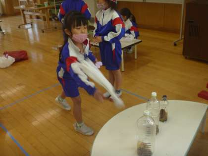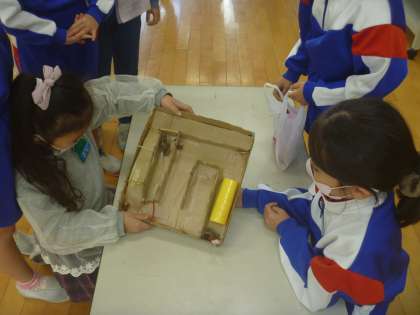 米田公園で集めたどんぐりや落ち葉を使って、おもちゃを作りました。どんぐり迷路、やじろべえ、どんぐりすくい、どんぐりマラカス、どんぐりのおうち等たくさんのおもちゃができました。今日は、みんなで遊んで楽しみました。