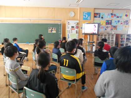テレビの画面を見ながら姿勢に気を付けている子供たちです。