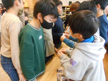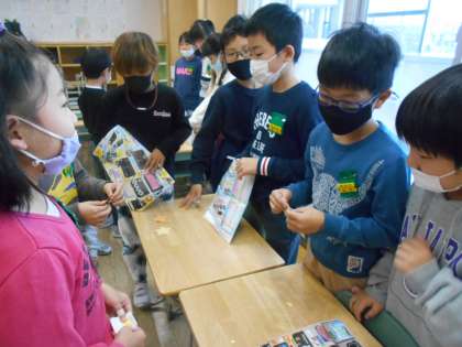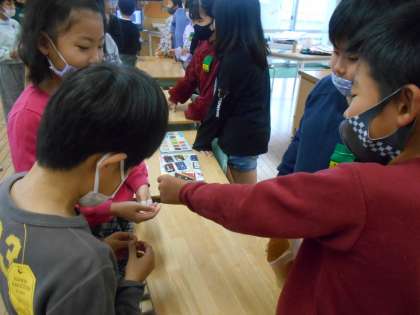 外国語で「What do you want?」を使ってクリスマスカードに使うために、いろいろな色や形に切った飾りを、お店屋さんのようにお互いに買い合いました。