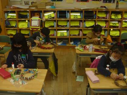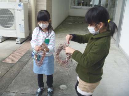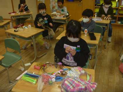 今日は、おうちから持ってきたリボンやモールで飾り付けをしました。