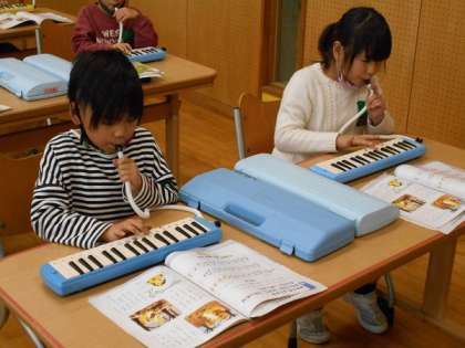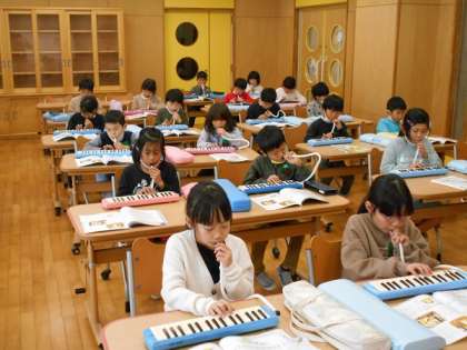 音楽科で、「小ぎつね」の鍵盤ハーモニカ演奏をしました。何度も練習して、指の引っ越しが上手になりました。