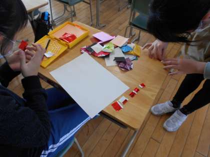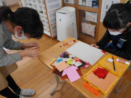 飾り係の子供たちが、クリスマス飾りを作っていました。教室に掲示し、季節感を味わってほしいと考えているそうです。