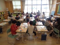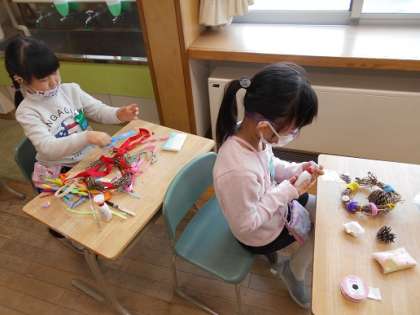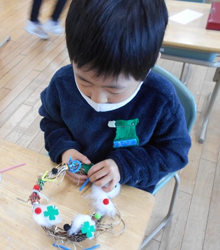 あさがおのつるで、あさがおリースを作りました。リボンやどんぐり等で飾り付けをして、可愛いリースができました。