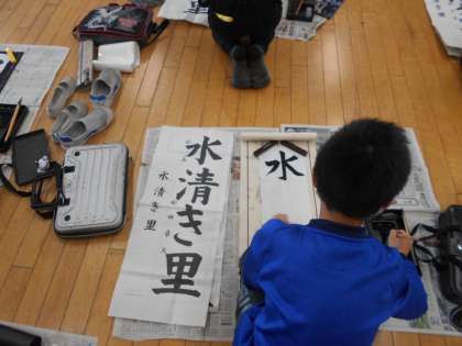 「水清き里」を一画一画書いています