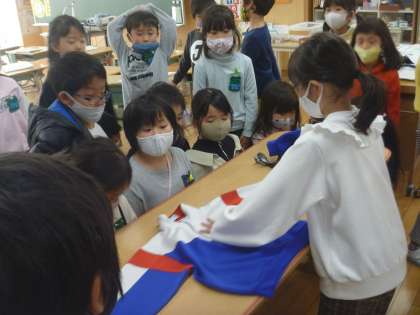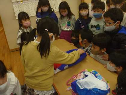 服のたたみ方を紹介してくれました。それぞれの家庭によって工夫があり、「わたしのやり方と同じだ」「こんなたたみ方があるんだね」と感想を伝え合いました。