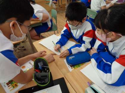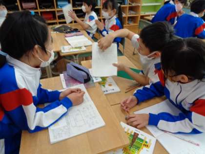 算数科「広さの表し方を考えよう」では、正三角形や長方形の面積の求め方をもとに複雑な形の面積の求めかたを考えました。自分の考えた方法を友達に説明している様子です。