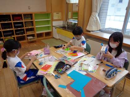 動く仕組みをストローで作って、楽しい作品を作っています。動きを試したり、飾り付けをしたりして、楽しみながら作っていました。