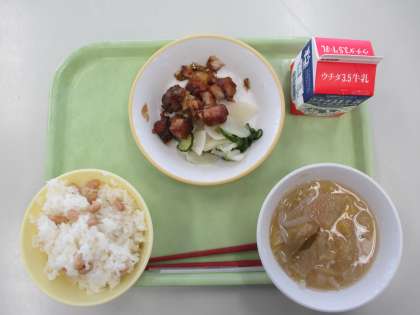 給食週間は、「本の世界を味わう 〜読んで楽しい、食べておいしいお話〜 」をテーマに本に登場する料理や食材を取り入れ、本にちなんだ献立が実施されました。