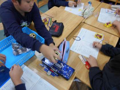 初めに電気を通す物なのかどうか予想を立てて、実際につなげて豆電球に明かりが灯るか確認しました。