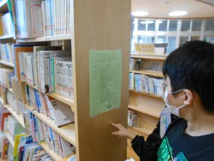 国語科の学習では、下級生に向けた本の紹介カード作りを題材に、目的や相手に合わせた伝わる文章の書き方について考えています。今日は、どのような本を紹介すればよいか、図書室で本を選びました。委員会活動で行われた人気ランキングに目を向け、相手がどんな本が好きかを考えている姿がありました。